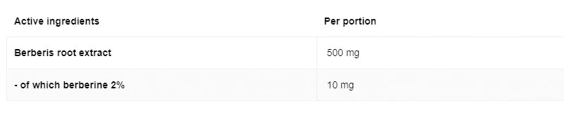 Összetevők: borbolya gyökér kivonat (Berberis aristata) standardizált 2% berberin tartalommal, csomósodást gátló anyag: mikrokristályos cellulóz (növényi), keményítő.